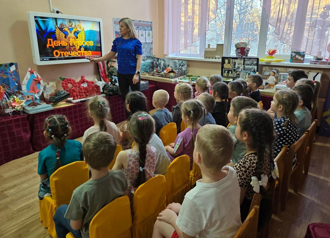 В честь этой даты в старшей группе «Белоснежка» была проведена экскурсия в "Музее Славы" с просмотром видеопрезентации "День Героев Отечества", с целью - формировать у дошкольников чувства патриотизма, чувства гордости и уважения к воинам, защитникам Отечества.