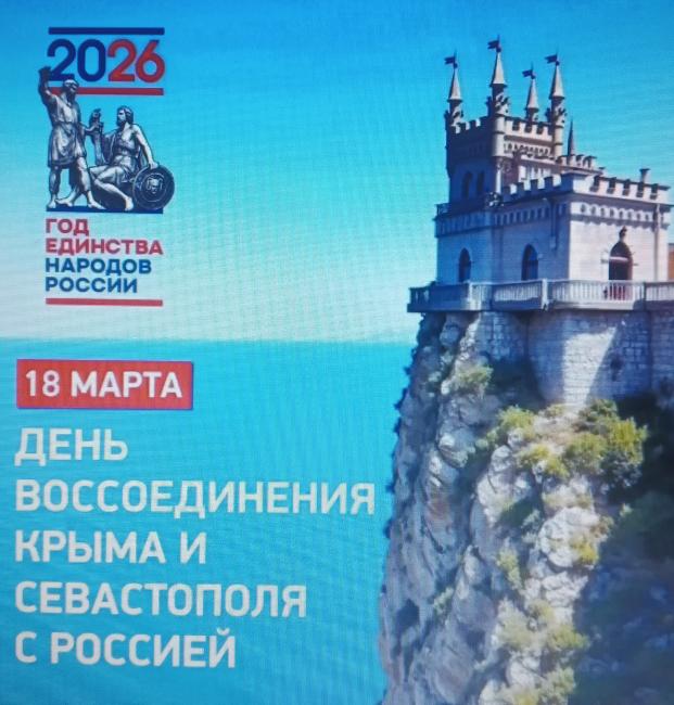 18 марта 2014 года произошло важное историческое событие для нашей страны- присоединение Крыма к России, то есть вхождение в состав Российской Федерации территории полуострова Крым. Теперь – это одно из главных праздников в истории новой России! Это праздник национального самосознания, национальной и государственной гордости, объединивший миллионы людей под символами исторической правды, мужественности и братства.